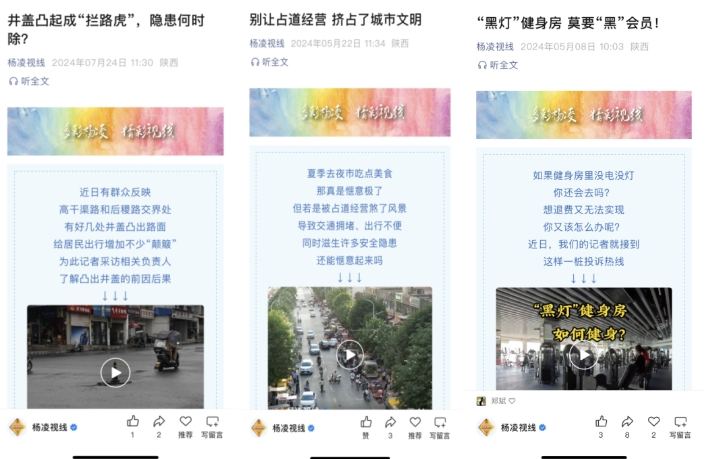 2024年集团开设全媒体社会民生栏目《杨凌视线》,聚焦群众衣食住行和急难愁盼问题开展舆论监督。通过监督报道解决了高干渠路和后稷路交界处井盖凸出、城区道路占道经营、部分小区存在消防隐患等问题,初步构建起“民有所需,我有所应”的舆论生态。