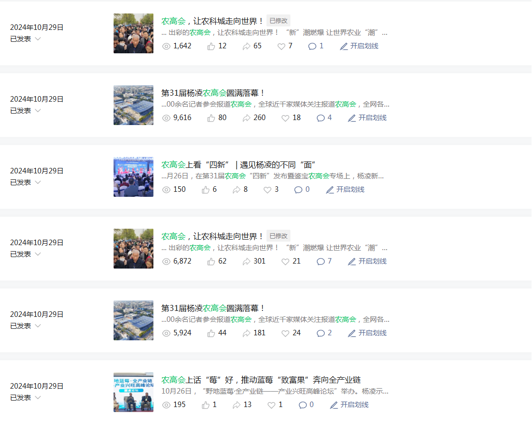 2024年,全力推进资源要素向移动端倾斜,优化整合涉农板块新媒体平台,强农APP二期建成投入使用,《农业科技报》入驻人民日报全国党媒平台,强农小程序实现优化升级,“明察暗访”公众号与“杨凌视线”合并运行,启动运营“学习强国”杨凌平台,成立AI工作室,推动内容生产向智媒转变。