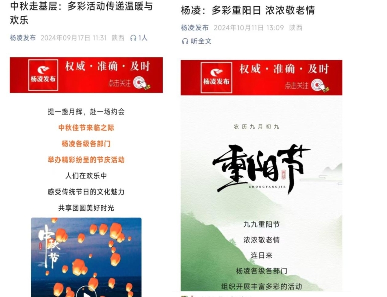 集团深入挖掘传统节日、重要节气的深厚文化内涵,营造舆论氛围。先后推出《我们的节日•清明|网上祭英烈活动启动!点击参与→》《包粽子、做香囊…杨凌多彩活动迎端午》《中秋走基层:多彩活动传递温暖与欢乐》《杨凌:多彩重阳日 浓浓敬老情》《我们的节日•七夕 | 杨凌将开展这些主题活动》等多篇报道。